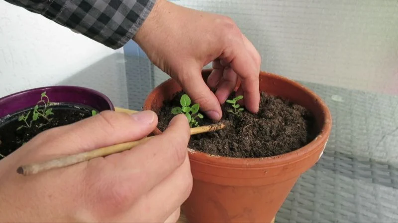 Eng stehende Oreganokeimlinge vereinzeln oder pikieren