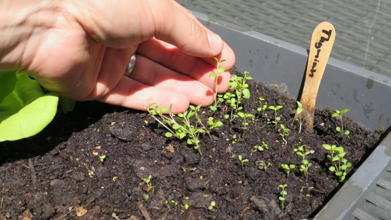 Sobald die Keimlinge wachsen und ihr erstes Paar Keimblattpaar entwickelt haben, muss der Deckel oder die Folie ab. Sonst wachsen die Keimlinge nur in die Länge und werden instabil. Ihr könnt jetzt beginnen, zu eng stehende Keimlinge zu vereinzeln. Da ihr aufgrund der feinen Samen wahrscheinlich ohnehin zu viele Keimlinge habt, könnt ihr überschüssige Keimlinge einfach herausrupfen. Zwischen den Keimen sollte mindestens 1 Zentimeter Platz entstehen. Nun können die Pflanzen noch weiterwachsen bis sie circa 3-5 Zentimeter groß sind.